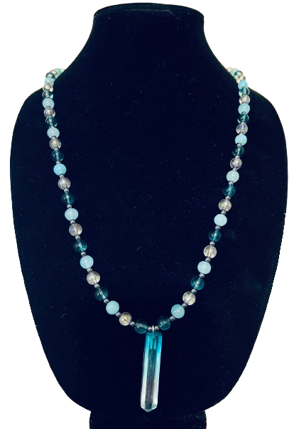 Blue glass bead necklace with resin crystal